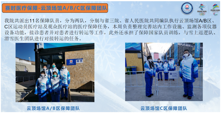 醫院派出49名醫療保障隊員參與張家口賽區保障任務,其中云頂場館A、B區6人,云頂C區5人,頒獎廣場11人,滑雪醫生4人,核酸檢測隔離點人員4人,以及興奮劑檢察官1人。